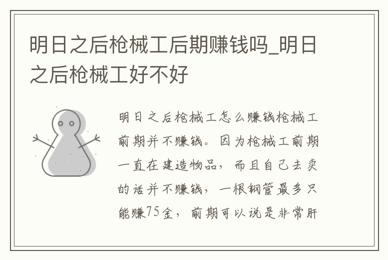槍械工前期并不賺錢。因為槍械工前期一直在建造物品,而且自己去賣的話并不賺錢,一根鋼管最多只能賺75金,前期可以說是非常肝。但是只要玩家自己能盡快升級,就能賺很多錢,因為到后期,不管是建造速度還是建造都有了。