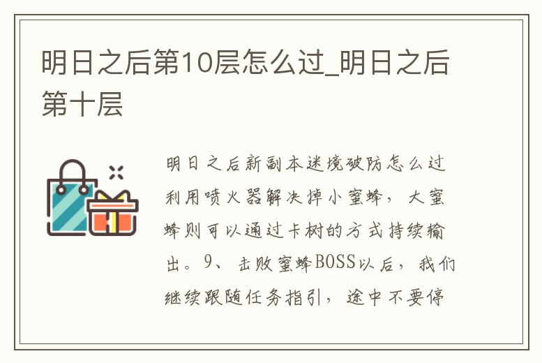 利用噴火器解決掉小蜜蜂,大蜜蜂則可以通過卡樹的方式持續輸出。9、擊敗蜜蜂BOSS以后,我們繼續跟隨任務指引,途中不要停留打怪,周圍的環境會讓我們掉血。10、擊敗最后的變異感染體,即可完成明日之后迷境詭林通關。