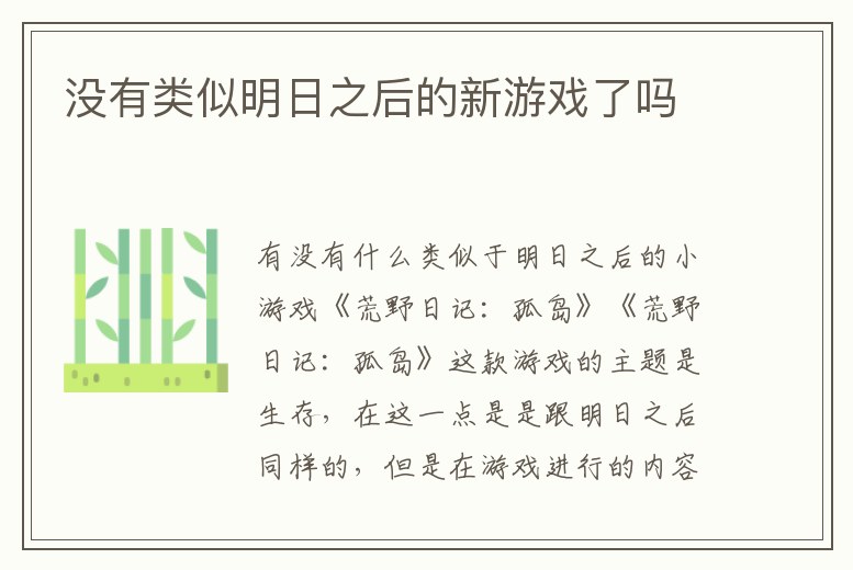 類似明日之后的pc端游如下:《文明曙光》,文明曙光這款末日生存游戲有著非常多的職業以及裝備選擇,玩家在游戲中想要生存下去那么就需要把自己的實力提升起來。《幸存者危城》,幸存者危城這款末日游戲有著各種不同的。