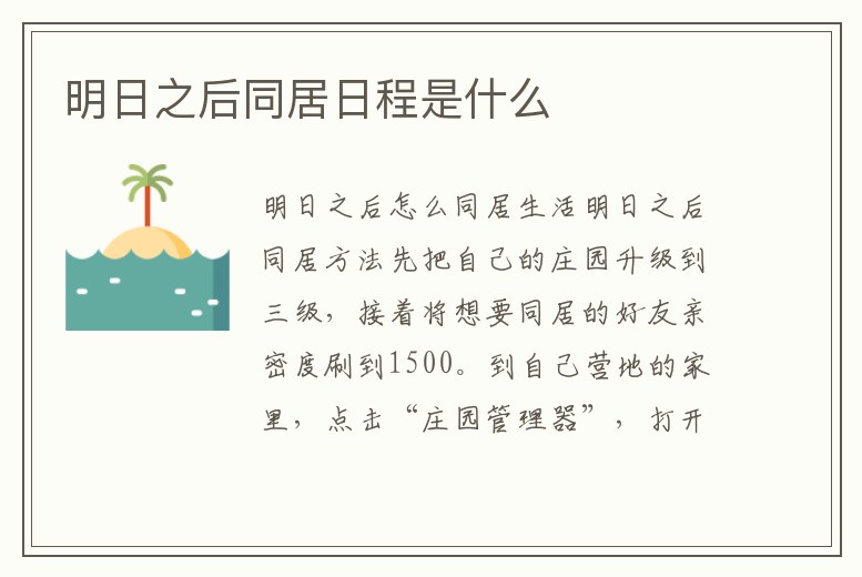 明日之后怎么同居生活明日之后同居方法先把自己的莊園升級到三級,接著將想要同居的好友親密度刷到1500。到自己營地的家里,點擊“莊園管理器”,打開莊園管理頁面。在莊園管理頁面找到“資料”按鈕,打開莊園資料頁面,會看到一個邀請好友同住的選項。1、明日之后怎么同居在明日之后同居,需要滿足以下條件:其中一人莊園等級達到三級。兩個人應互為好友,且好