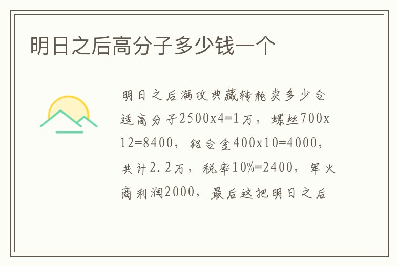 高分子2500x4=1萬,螺絲700x12=8400,鋁合金400x10=4000,共計2.2萬,稅率10%=2400,軍火商利潤2000,最后這把明日之后滿攻典藏轉(zhuǎn)輪會穩(wěn)定在2.6萬左右。《明日之后》是一款由杭州網(wǎng)易雷火科技有限公司運營的末日生存手機。
