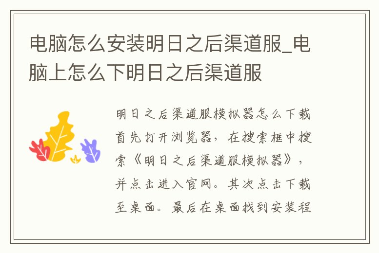 首先打開瀏覽器,在搜索框中搜索《明日之后渠道服模擬器》,并點擊進入官網。其次點擊下載至桌面。最后在桌面找到安裝程序,雙擊打開并運行即可。