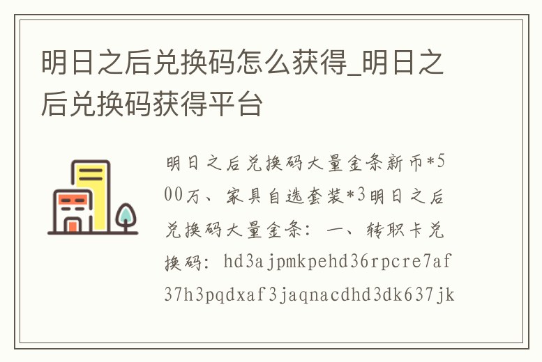 明日之后兌換碼大量金條新幣*500萬、家具自選套裝*3明日之后兌換碼大量金條:一、轉職卡兌換碼:hd3ajpmkpehd36rpcre7af37h3pqdxaf3jaqnacdhd3dk637jkhd3dhwmew6二、其他道具