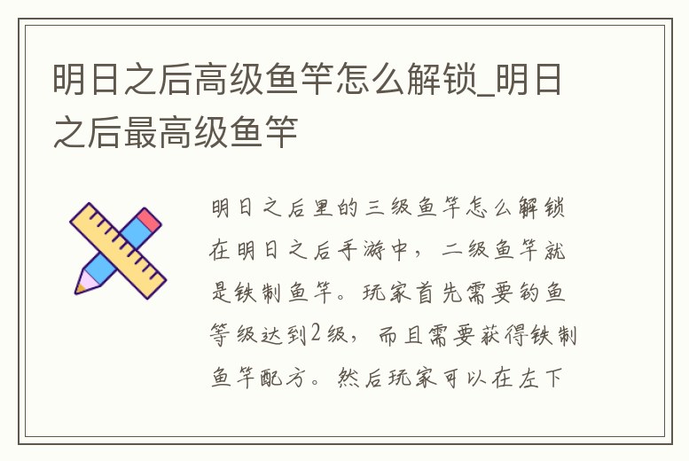 釣魚魚竿。根據《明日之后》游戲攻略得知,明日之后釣魚十級解鎖釣魚魚竿,《明日之后》是一款架空題材的,核心體驗為廢土生存合作的3D多人在線手游,本游戲主打廢土合作生存玩法,以在廢土中引導玩家互相幫助,克服惡劣環境。