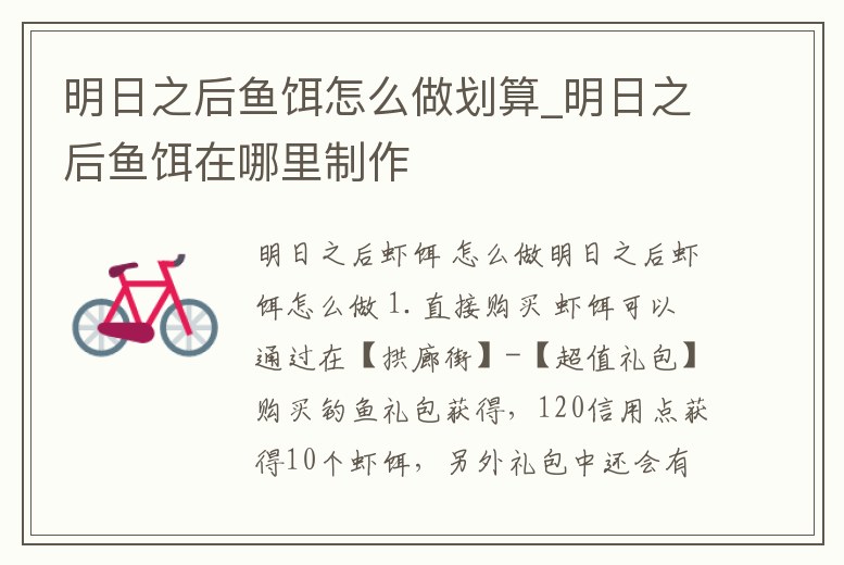 明日之后蝦餌怎么做 1.直接購買 蝦餌可以通過在【拱廊街】-【超值禮包】購買釣魚禮包獲得,120信用點(diǎn)獲得10個蝦餌,另外禮包中還會有魚竿、其他魚餌等,是超值的釣魚禮包,喜歡釣魚的玩家可以考慮直接購買;2.對蝦制作 在釣。