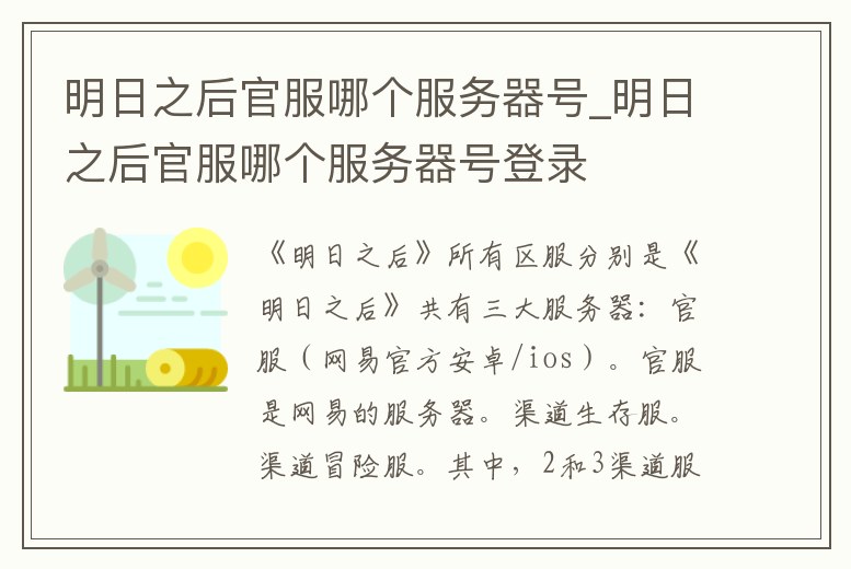 《明日之后》共有三大服務器:官服(網易官方安卓/ios)。官服是網易的服務器。渠道生存服。渠道冒險服。其中,2和3渠道服,可以理解為各種手機品牌轉過手的服務器——類似手機商要提取一定的費用。游戲是網易開。