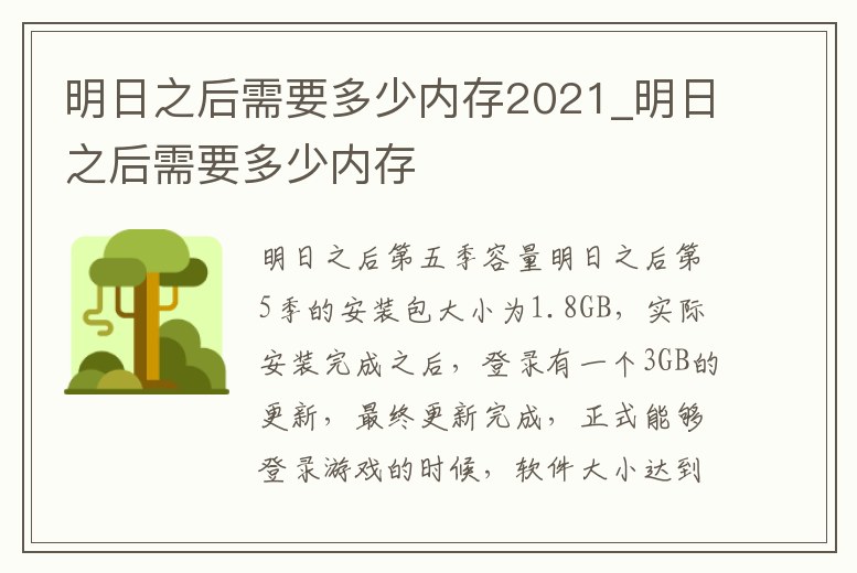 1.2g的內存 根據應用商店來看,明日之后這個游戲需要2g的內存,而在下載完成并更新完成后大約也不會超過5個g,因為它要儲存你的數據 。