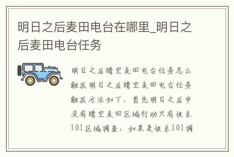 明日之后晴空麥田電臺任務觸發方法如下。首先明日之后中沒有晴空麥田區域行動只有快樂101區域調查,如果是快樂101調查,觸發方法如下:首先打開地圖,前往坐標為:-49644,-8671的位置。來到電臺的旁邊,點擊F查看。