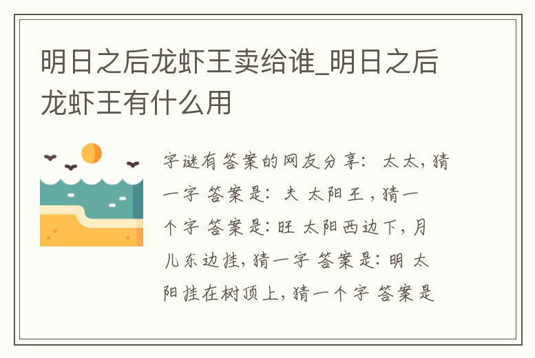 網友分享:太太,猜一字 答案是: 夫 太陽王 ,猜一個字 答案是:旺 太陽西邊下,月兒東邊掛,猜一字 答案是:明 太陽掛在樹頂上,猜一個字 答案是:果 孔子登山,猜一字 答案是:岳 孔明定下空城計,蘇秦能說六國平,六郎要斬親生子,宗保不舍。