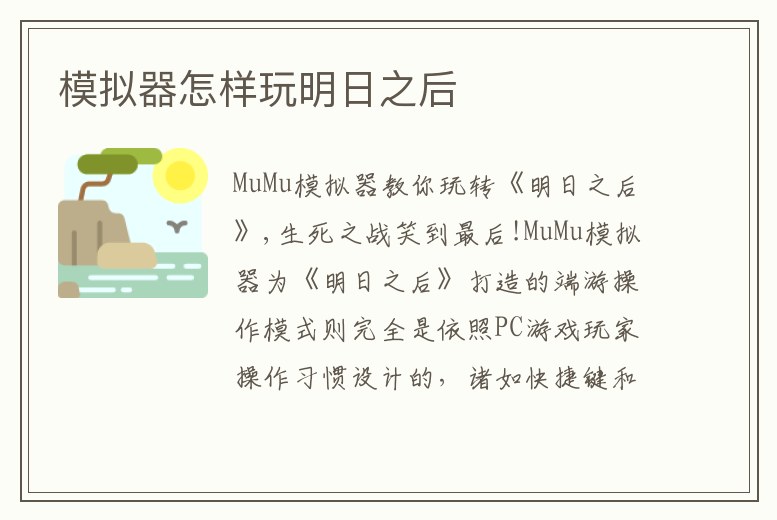 使用【MuMu模擬器】玩明日之后,可以享受官方專設(shè)的求生鍵位,操作更加靈活方便,提高人物生存率。下面是下載使用【MuMu模擬器】玩明日之后的具體操作步驟:1. 下載安裝網(wǎng)易【MuMu模擬器】,建議前往網(wǎng)易官方或者官方合作站點下載。