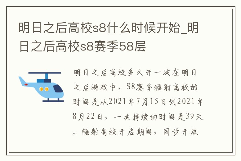 在明日之后游戲中,S8賽季輻射高校的時間是從2021年7月15日到2021年8月22日,一共持續的時間是39天。輻射高校開啟期間,同步開放高校證書活動,完成任務獲得專屬珍貴配件寶箱、專屬時裝源碼風暴等珍稀道具。