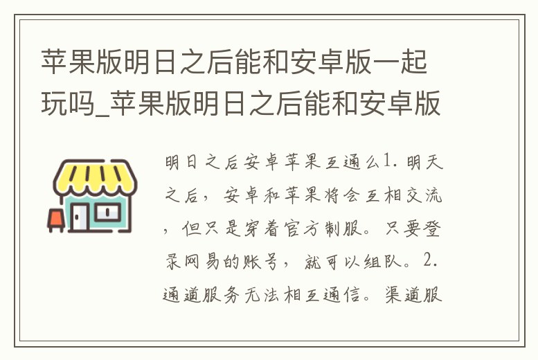 1.明天之后,安卓和蘋果將會互相交流,但只是穿著官方制服。只要登錄網易的賬號,就可以組隊。2.通道服務無法相互通信。渠道服務只有安卓用戶,只能和安卓用戶組隊,不能和蘋果用戶玩。3.在游戲中,兩個系統的角色和物品是不。