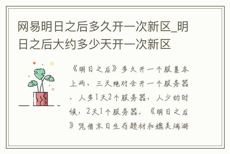 明日之后多久開一個服:開新區的時間是由玩家人數來決定的。如果玩家人數很多的話,一天可以開好幾個區;如果玩家人數很少的話,可能幾天才開一個區。至于具體時間,大家可以去自行查詢官網。明日之后一局玩多久:明日之后沒。