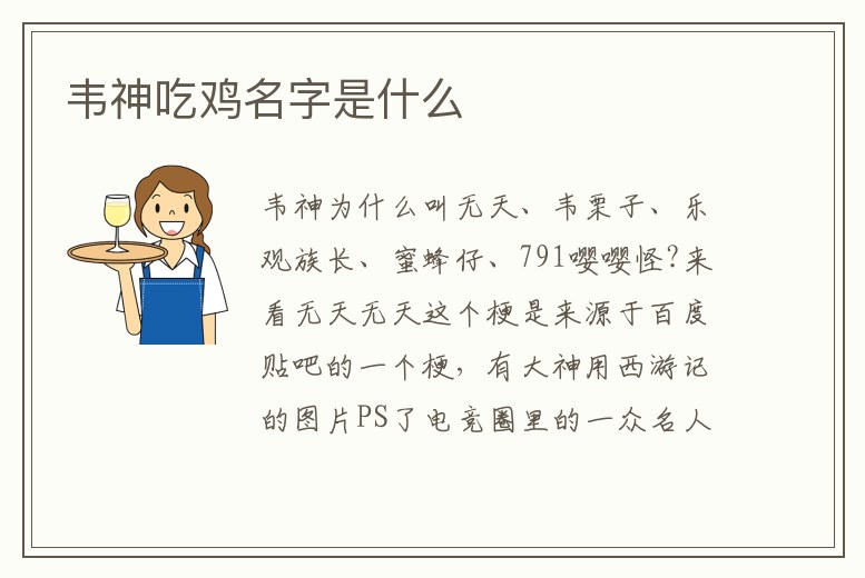 無(wú)天無(wú)天這個(gè)梗是來(lái)源于百度貼吧的一個(gè)梗,有大神用西游記的圖片PS了電競(jìng)?cè)锏囊槐娒私小峨姼?jìng)西游后傳》,其中韋神被PS成無(wú)天,而Pawn被PS稱如來(lái),這里就有了無(wú)天戰(zhàn)如來(lái)的梗,韋神無(wú)天的名字也就這么來(lái)的!還有一。