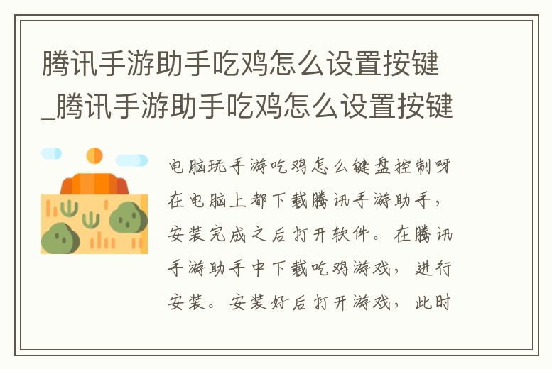 在電腦上都下載騰訊手游助手,安裝完成之后打開軟件。在騰訊手游助手中下載吃雞游戲,進行安裝。安裝好后打開游戲,此時可以通過點擊軟件右側的工具欄中的“鍵位設置”進行鍵位的更改。輔助按鍵設定,你可以通過勾。