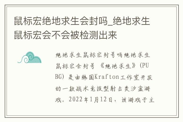 絕地求生鼠標(biāo)宏會(huì)封號(hào) 《絕地求生》(PUBG) 是由韓國(guó)Krafton工作室開(kāi)發(fā)的一款戰(zhàn)術(shù)競(jìng)技型射擊類沙盒游戲。2022年1月12日,該游戲于主機(jī)和PC上可免費(fèi)下載游玩。在該游戲中,玩家需要在游戲地圖上收集各種資源,并在不斷縮小的安。