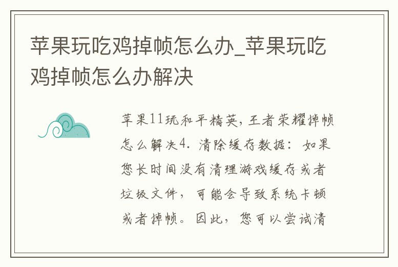 4. 清除緩存數據:如果您長時間沒有清理游戲緩存或者垃圾文件,可能會導致系統卡頓或者掉幀。因此,您可以嘗試清除游戲緩存和臨時文件,以恢復系統的正常運行速度。以上是一些解決蘋果11玩和平精英或者王者榮耀掉幀問題的方法,希望。
