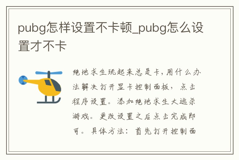 絕地求生玩起來總是卡,用什么辦法解決打開顯卡控制面板,點(diǎn)擊程序設(shè)置。添加絕地求生大逃殺游戲。更改設(shè)置之后點(diǎn)擊完成即可。具體方法:首先打開控制面板,進(jìn)入控制面板以后“打開硬件和聲音”然后在硬件和聲音里面選擇打開顯卡控制面板進(jìn)入到顯卡控制面板以后,點(diǎn)擊“管理。1、