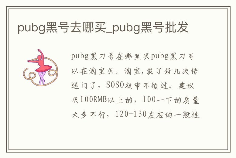 pubg黑刀號在哪里買pubg黑刀可以在淘寶買。淘寶,發了好幾次傳送門了,SOSO核審不給過。建議買100RMB以上的,100一下的質量大多不行,120-130左右的一般性比價比較高。1、和平精英黑號在哪里可以買到交易貓網站。根據調查和平精英的相關資料得知,和平精英黑號可以在交易貓網站上購買到。《和平精英》是由騰訊