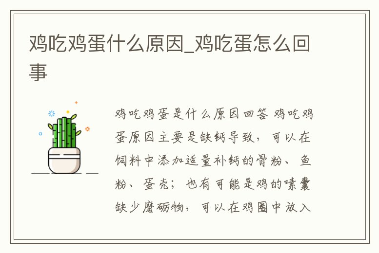 雞吃蛋原因是飼料不合適、飲水不足、產蛋箱數量不足等等。飼料不合適 如果平時飼喂的飼料中缺乏礦物質或者蛋白質,或者飼料中動物性的蛋白質偏多,那么都有可能出現母雞吃雞蛋的情況。飲水不足 如果母雞長期處于饑渴的。