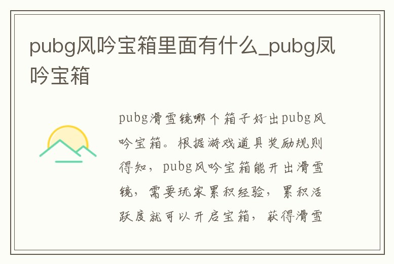 pubg風吟寶箱。根據游戲道具獎勵規則得知,pubg風吟寶箱能開出滑雪鏡,需要玩家累積經驗,累積活躍度就可以開啟寶箱,獲得滑雪鏡。游戲十分有趣,深得玩家喜愛。