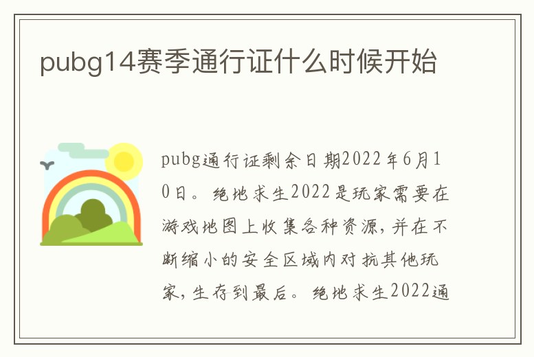 pubg通行證剩余日期2022年6月10日。絕地求生2022是玩家需要在游戲地圖上收集各種資源,并在不斷縮小的安全區(qū)域內(nèi)對抗其他玩家,生存到最后。絕地求生2022通行證從2022年1月10日開始結(jié)束是2022年6