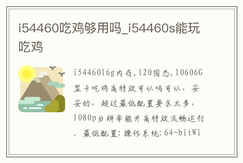 i5446016g內(nèi)存,120固態(tài),10606G顯卡吃雞高特效可以嗎可以,妥妥的,超過最低配置要求太多,1080p分辨率能開高特效流暢運(yùn)行。最低配置:操作系統(tǒng):64-bitWindows7,Windows8.1,Windows10處理器:IntelCorei3-4340/AMDFX-6300內(nèi)存:6GBRAM圖形:nVidiaGeForceGTX。2、i54460玩大型
