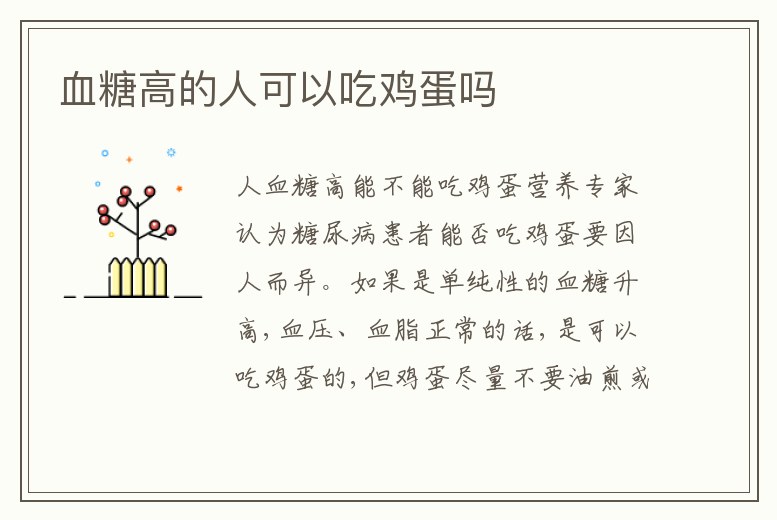 問題一:血糖高的人能否吃雞蛋 病情分析:血糖有些高,是可以吃雞蛋的,雞蛋內主要是蛋白質(尤其是蛋白,宜多吃意見建議:吃飯和吃饅頭等面食,含糖量基雞相近,一些粗糧如高亮,大麥等含糖量比較低.另外芋艿,土豆,藕,山芋等。