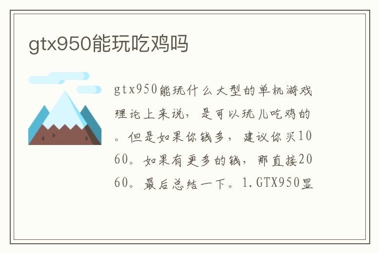 絕地求生。顯卡950內存較大,使用起來畫質高清,絕地求生占用內存空間較大,游戲畫質需要使用高清才能帶來更好的游戲體驗,所以顯卡950能玩的吃雞游戲有絕地求生。GeForce GTX950是專為PC玩家打造的一款游戲GPU,將PC變成可媲美PS。