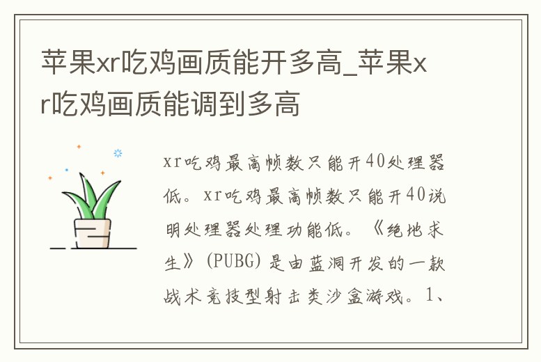 處理器低。xr吃雞最高幀數只能開40說明處理器處理功能低。《絕地求生》(PUBG)是由藍洞開發的一款戰術競技型射擊類沙盒游戲。