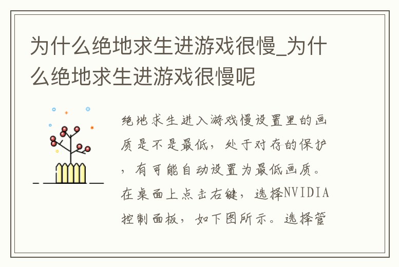 絕地求生進(jìn)入游戲慢設(shè)置里的畫質(zhì)是不是最低,處于對存的保護(hù),有可能自動(dòng)設(shè)置為最低畫質(zhì)。在桌面上點(diǎn)擊右鍵,選擇NVIDIA控制面板,如下圖所示。選擇管理3D設(shè)置,如下圖所示。點(diǎn)擊全局設(shè)置,如下圖所示。三重緩沖,設(shè)置為關(guān),如。1、吃雞進(jìn)游戲太慢,每次進(jìn)去飛機(jī)都已經(jīng)快飛完整個(gè)地圖了機(jī)械硬盤讀寫速度慢,換固態(tài)硬