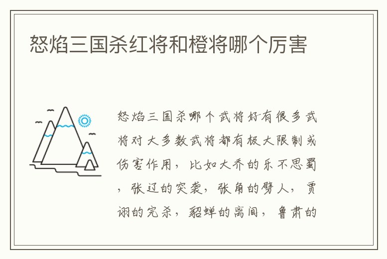 孫權: 三國殺中單挑自古有孫權很強的說法,雖然怒焰三國殺不能制衡裝備,但是依然不能否認孫權的強度,門票可以用孫權香香兄妹組合過裝備爆發!大喬: 我不太喜歡玩大喬,但是只要是競技場基本都回ban點大喬,樂不思蜀威懾力!