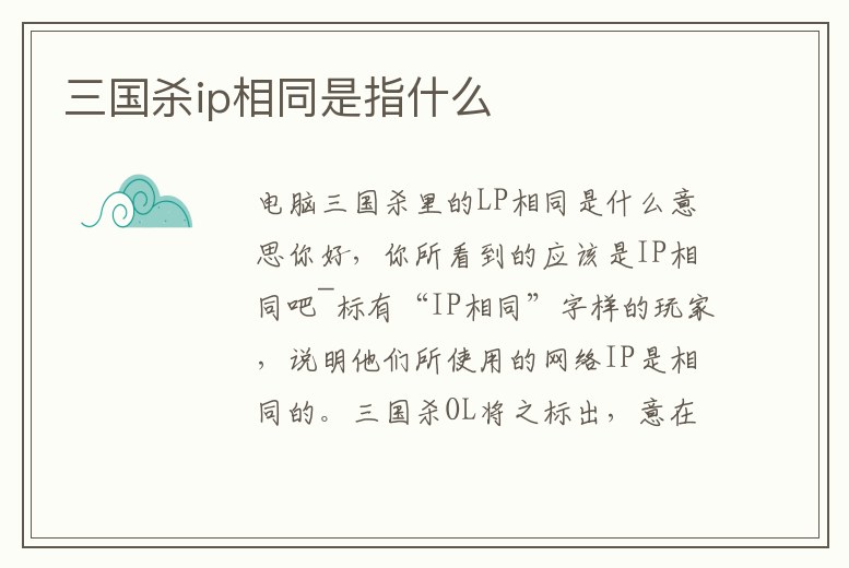 電腦三國殺里的LP相同是什么意思你好,你所看到的應該是IP相同吧~標有“IP相同”字樣的玩家,說明他們所使用的網絡IP是相同的。三國殺OL將之標出,意在提醒其他玩家,這些IP相同的玩家很可能存在“開黑”的情況(當然也不是100%)。1、三國殺如何才算同一IP三國殺的同一IP用戶,事實上指使用同一子網掩碼的多個用戶,使用同一路由器或者交換機分配IP地址的下屬計算機都是會使用同一子網掩碼的,