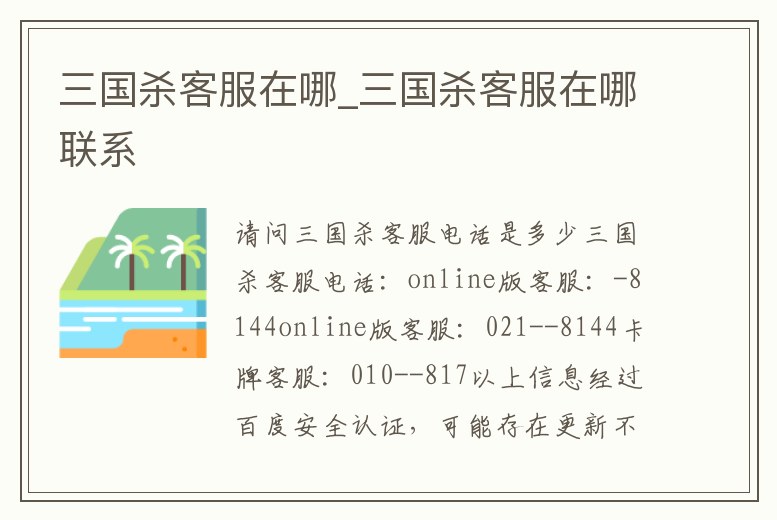 請問三國殺客服電話是多少三國殺客服電話:online版客服:-8144online版客服:021--8144卡牌客服:010--817以上信息經過百度安全認證,可能存在更新不及時,請以官網信息為準官網客服信息請點擊:2、三國殺賬號不記得了,怎么