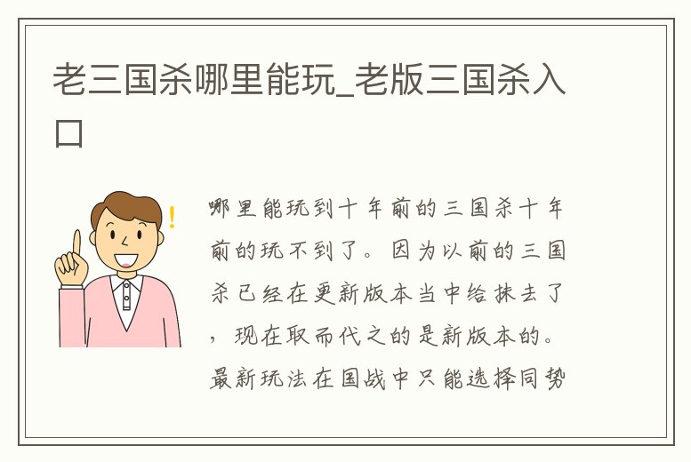 答:三國殺老版本在哪下載——這是一套即時策略大型網絡游戲,三國殺續作之一也包括了老版本了,所以,在各大應用商店中可以成功獲得下載了;回答完畢。