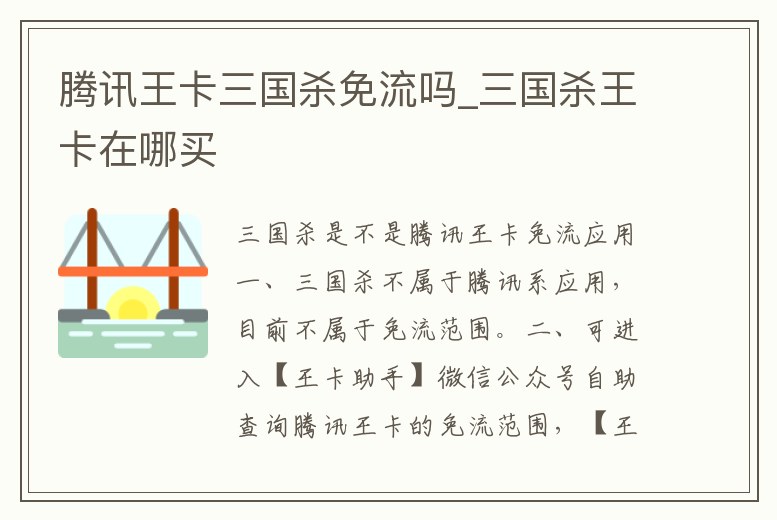 一、三國殺不屬于騰訊系應用,目前不屬于免流范圍。二、可進入【王卡助手】微信公眾號自助查詢騰訊王卡的免流范圍,【王卡助手】入口:1.服務-客服中心-免流特權;2.特權-免流應用中心-免流說明。以上路徑以查詢頁面實際。