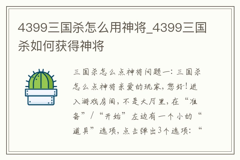 4399三國殺怎么用神將_4399三國殺如何獲得神將