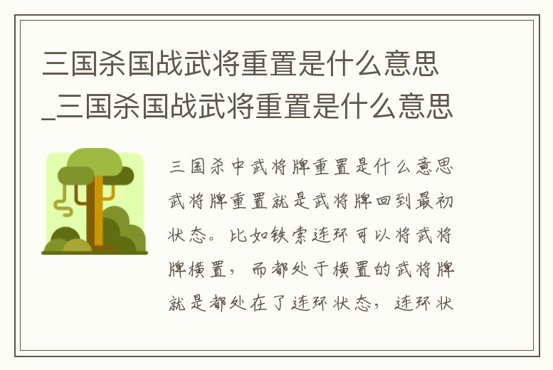 三國殺中武將牌重置是什么意思武將牌重置就是武將牌回到最初狀態。比如鐵索連環可以將武將牌橫置,而都處于橫置的武將牌就是都處在了連環狀態,連環狀態下的一名武將受到火攻、屬性殺、雷擊、閃電等屬性傷害,其他武將都會收到傷害)。如果在受到傷害前想。1、三國殺中重置什么意思問題六:三國殺國戰什么叫重置三國殺中重置指【鐵索連環】一牌中的重置,這個重置只針對橫置即【鐵索連環】狀態,不影響翻面,換言之就