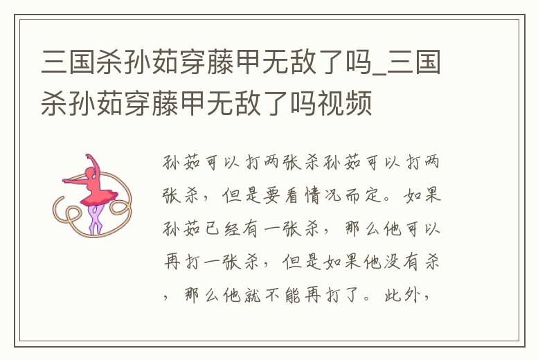孫茹可以打兩張殺孫茹可以打兩張殺,但是要看情況而定。如果孫茹已經有一張殺,那么他可以再打一張殺,但是如果他沒有殺,那么他就不能再打了。此外,孫茹還需要考慮他的牌型,如果他有一對,那么他可以考慮打一張殺,但是如果他只有單。1、三國