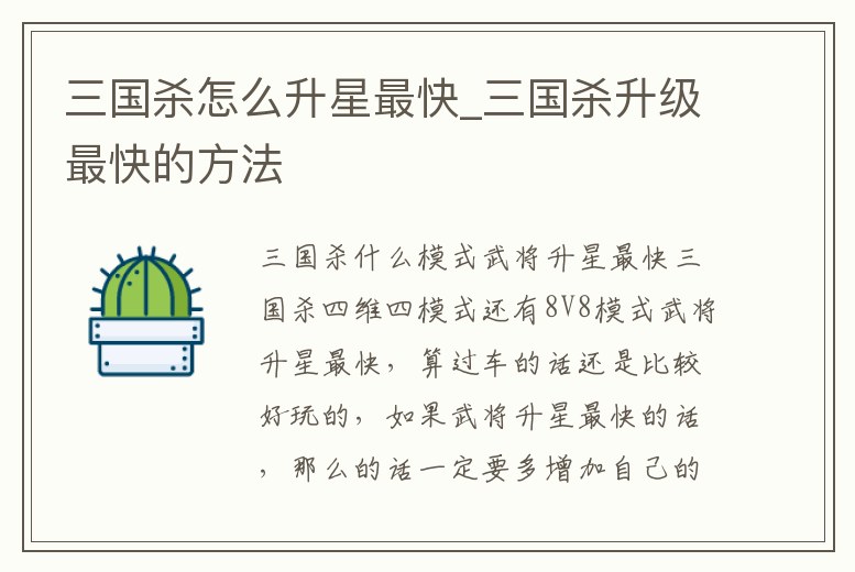 三國殺什么模式武將升星最快三國殺四維四模式還有8V8模式武將升星最快,算過車的話還是比較好玩的,如果武將升星最快的話,那么的話一定要多增加自己的武力值,還有自己的熟練度。1、三國殺怎么升級快問題一:三國殺怎么升級快啊以最快的速度謝謝1.最快的方法就是建個專刷經驗的房,不過不太好弄,畢竟沒多少人愿意當陪練。2.和幾個朋友一起開黑房,無論你是哪方,讓他們幫