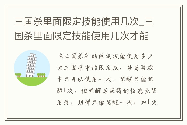 三國殺中的限定技,每局游戲中只可以使用一次。覺醒只能覺醒1次,但覺醒后獲得的技能無限用呀,劉禪只能覺醒一次,加1次血,但激將可以無限用的,其他也類似。目前已存在的限定技包括:龐統(tǒng)【涅_】,賈詡【亂武】,廖化【。