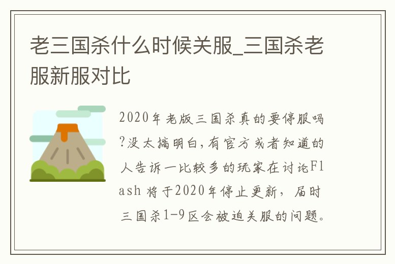 比較多的玩家在討論Flash 將于2020年停止更新,屆時三國殺1-9區(qū)會被迫關(guān)服的問題。再次特別說明下,Adobe宣布2020年正式停止支持Flash,并不代表2020年Flash將無法使用。三國殺OL老服是我們?nèi)龂鴼⒌母荆覀儾粫膊豢赡芡!?/p>