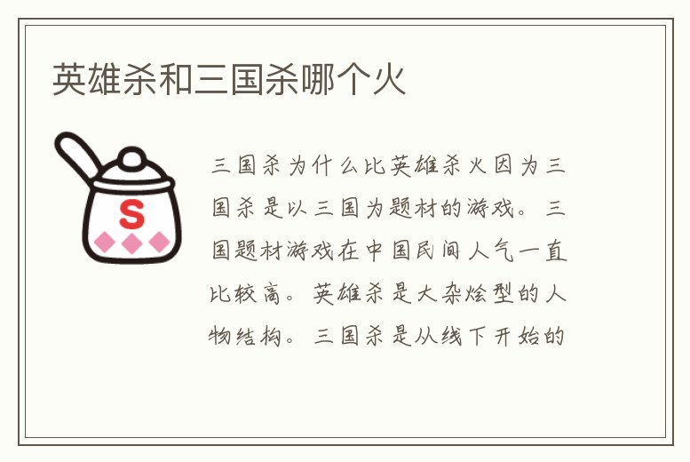 因為三國殺是以三國為題材的游戲。三國題材游戲在中國民間人氣一直比較高。英雄殺是大雜燴型的人物結(jié)構(gòu)。三國殺是從線下開始的。起步比英雄殺早。基礎(chǔ)就厚一些。包括線下線上的各種比賽。做到了電競層面。英雄殺是騰訊仿照三國。