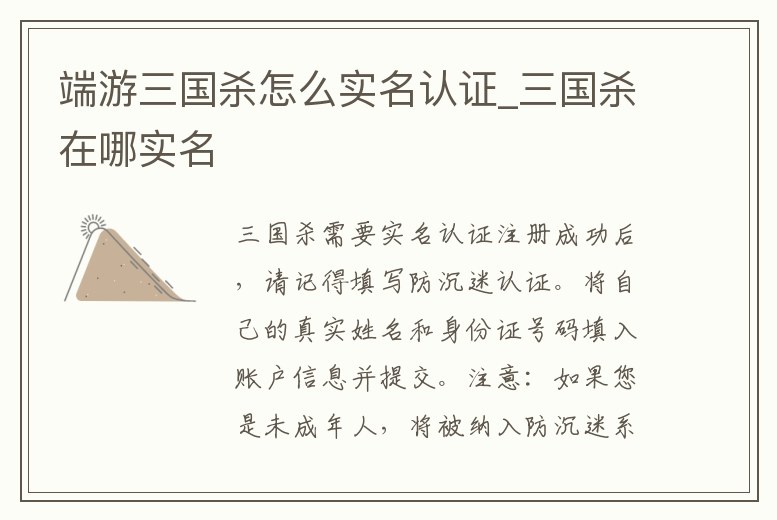 注冊成功后,請記得填寫防沉迷認證。將自己的真實姓名和身份證號碼填入賬戶信息并提交。注意:如果您是未成年人,將被納入防沉迷系統中,受到防沉迷系統的限制。以上內容參考三國殺-三國殺OL防沉迷使用指南 。