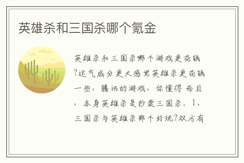 感覺英雄殺更花錢一些,騰訊的游戲,你懂得 而且,本身英雄殺是抄襲三國殺。