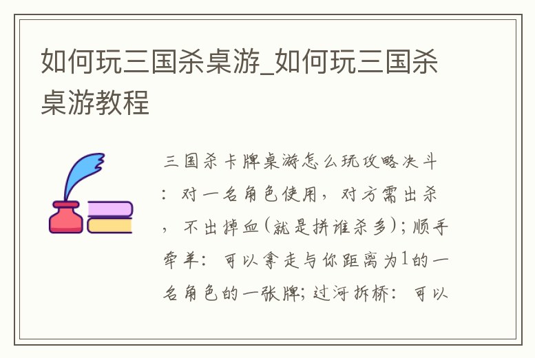 也可以在手機上、電腦上玩,單機聯機任你選。 教你如何玩轉桌游三國殺游戲 基本牌: 殺:每輪只能出一次,被殺的對象掉一滴血。(某些人物如呂布可一張殺當兩次殺,張飛無限制,依據武將牌下文字說明有個別現象) 閃:躲閃一次殺,不掉血。