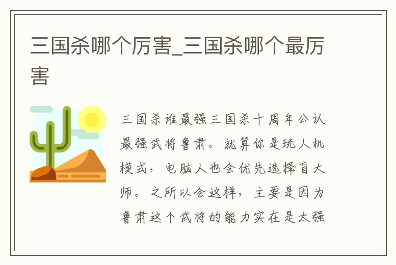 三國殺誰最強三國殺十周年公認最強武將魯肅。就算你是玩人機模式,電腦人也會優先選擇盲大師。之所以會這樣,主要是因為魯肅這個武將的能力實在是太強了,這個武將有著3輪決定勝負的能力,所以又叫做“魯三輪”。為啥這么說呢?因為魯肅之。1、三國殺十大最強角色《三國殺》十大最強角色分別是:張讓、王