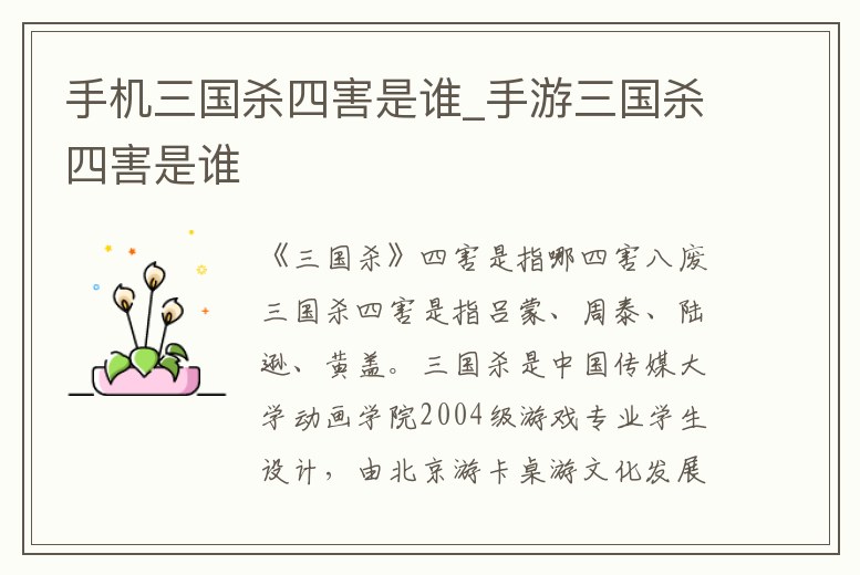 三國殺四害是指呂蒙、周泰、陸遜、黃蓋。三國殺是中國傳媒大學動畫學院2004級游戲專業學生設計,由北京游卡桌游文化發展有限公司出版發行的一款熱門的桌上游戲。所謂四害,即三國殺斗地主模式中農民所使用的一種名為不動白的武。