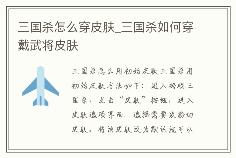 三國殺怎么用初始皮膚三國殺用初始皮膚方法如下:進入游戲三國殺,點擊“皮膚”按鈕,進入皮膚選項界面。選擇需要裝扮的皮膚。將該皮膚設為默認就可以了。1、三國殺手游怎么穿皮膚在最上邊,靠右點,有一個小衣服的圖案,就是換膚。2、三國殺沒有武將怎么穿皮膚三國殺沒有武將怎么穿皮膚,進入游戲后,選好有皮膚的武將。選好后,長按人物欄