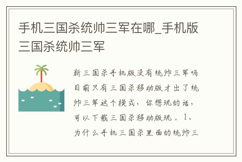 目前只有三國殺移動版才出了統帥三軍這個模式,你想玩的話,可以下載三國殺移動版玩 。